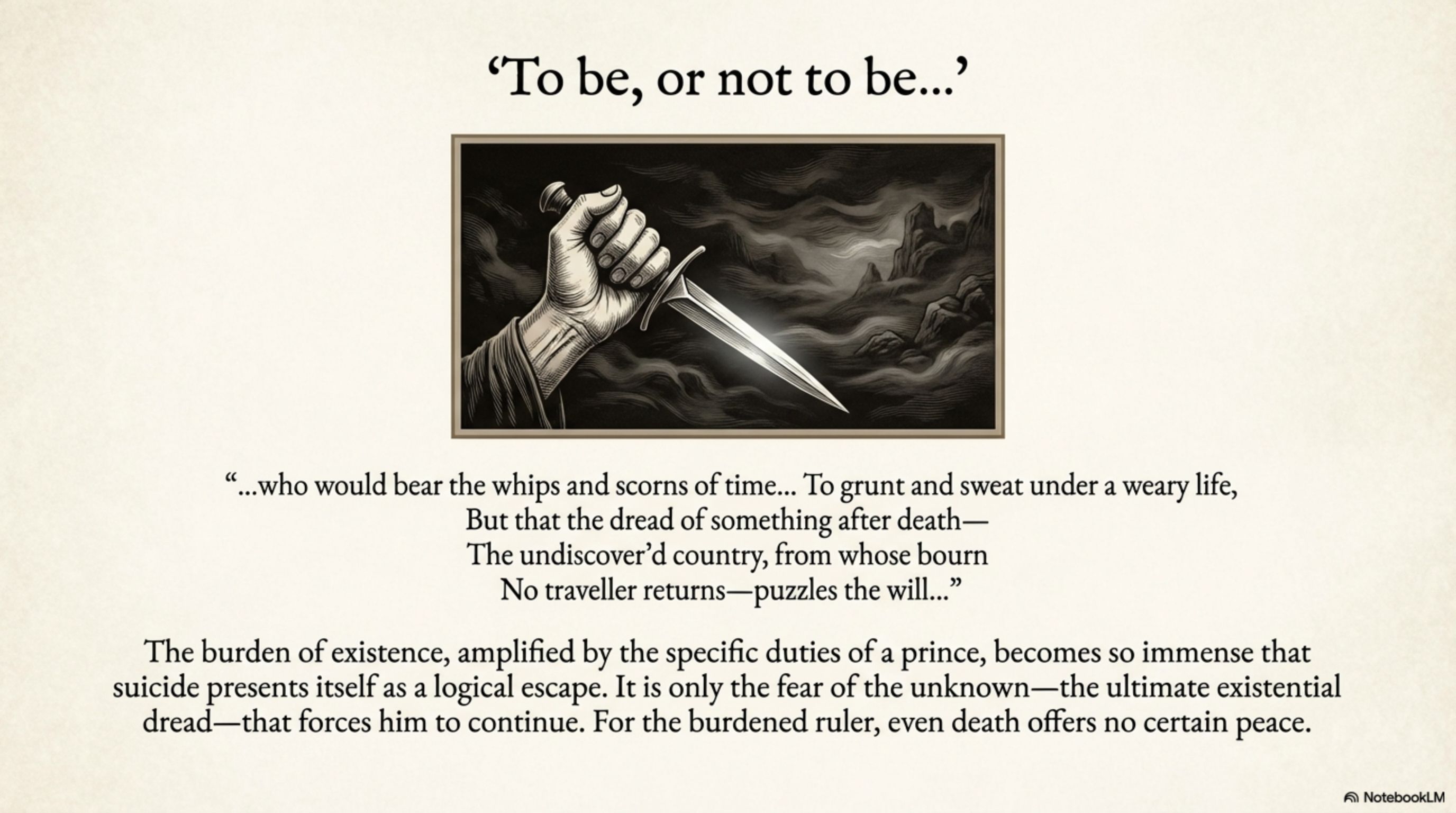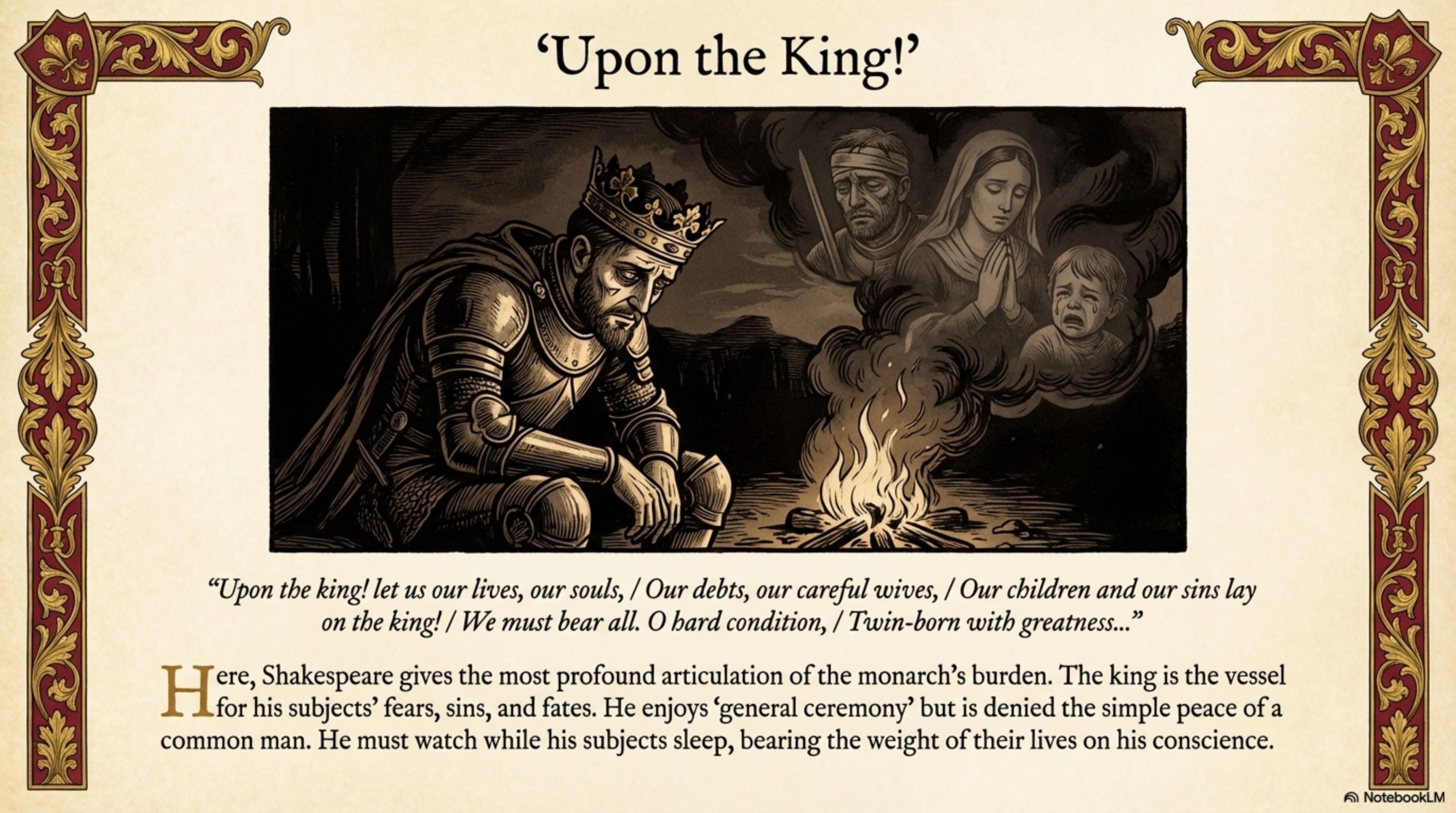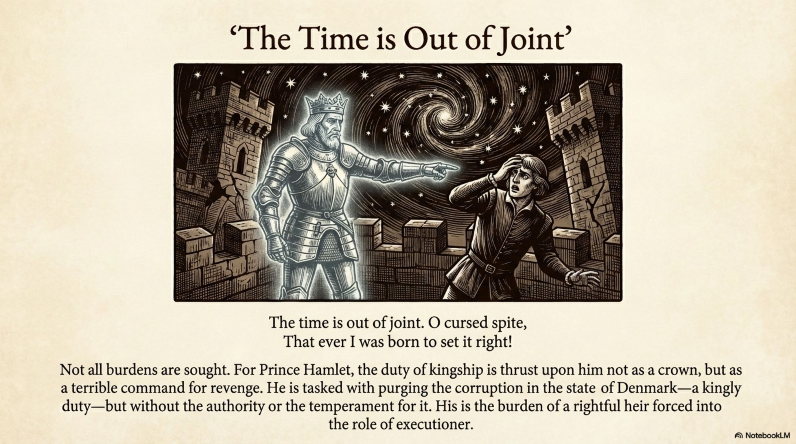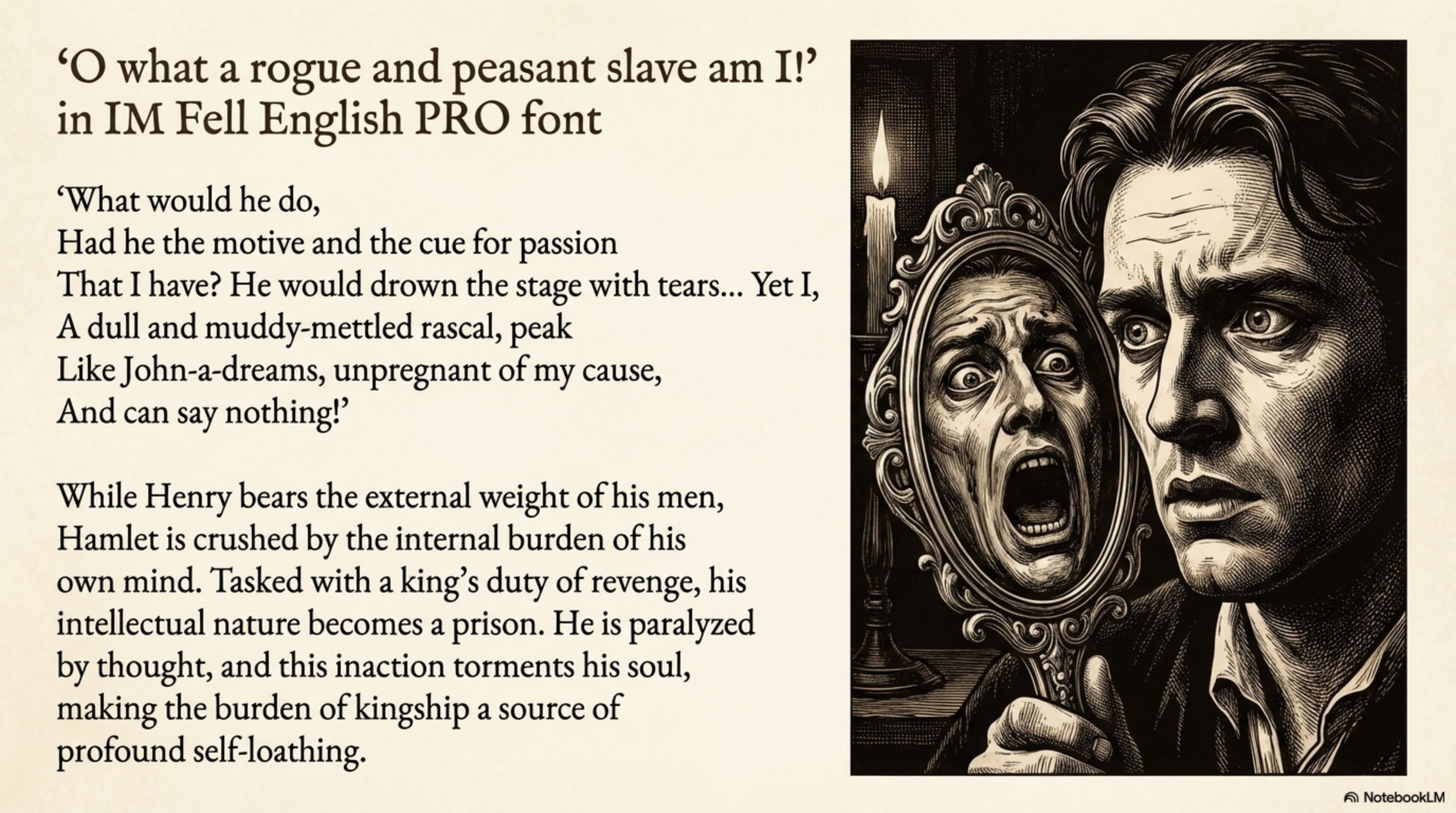While Henry bears the external weight of his men, Hamlet is crushed by the internal burden of his own mind. Tasked with a king's duty of revenge, his intellectual nature becomes a prison. He is paralyzed by thought, and this inaction torments his soul, making the burden of kingship a source of profound self-loathing.