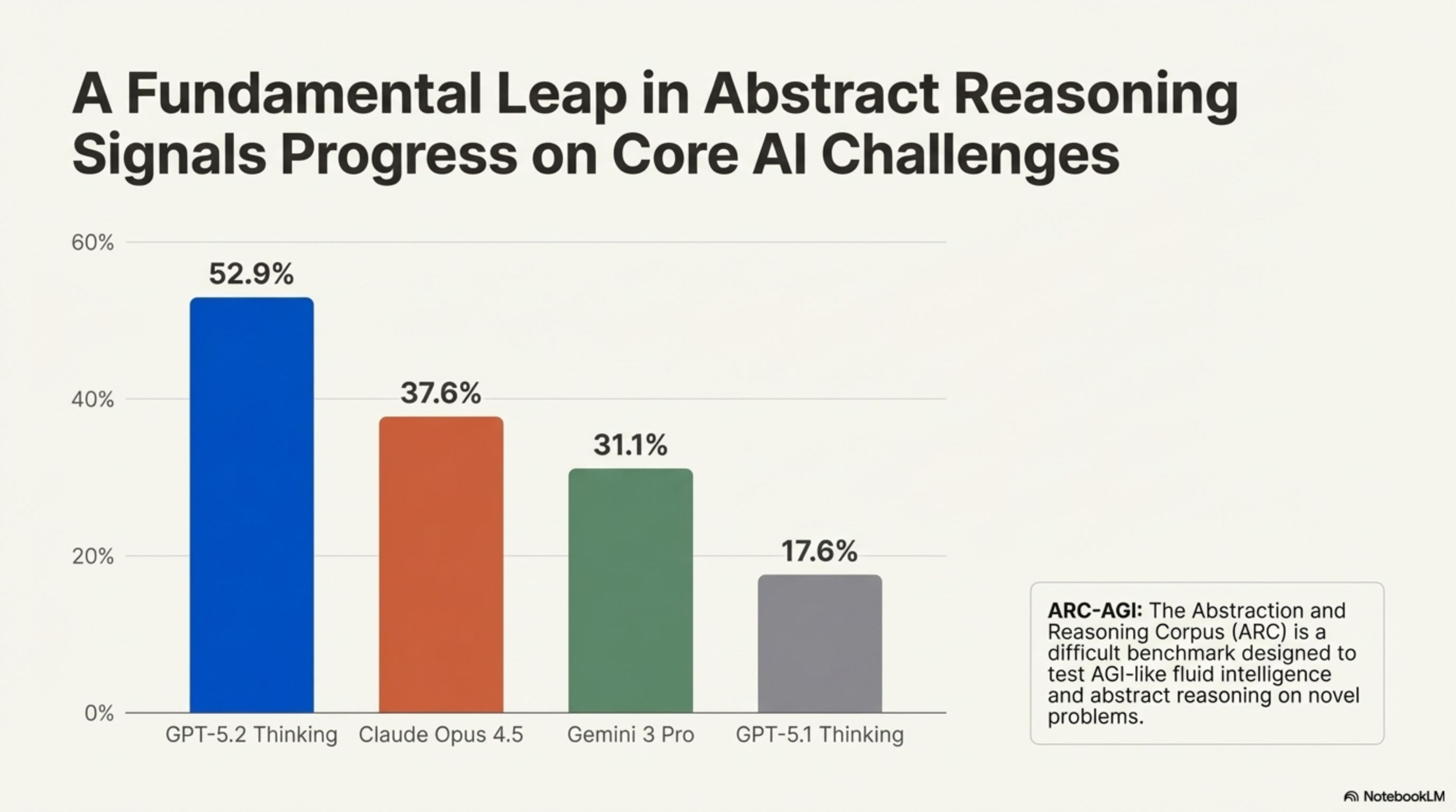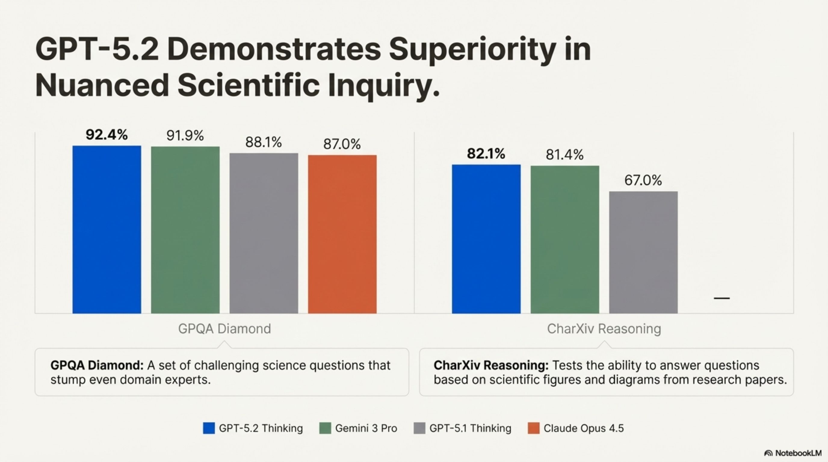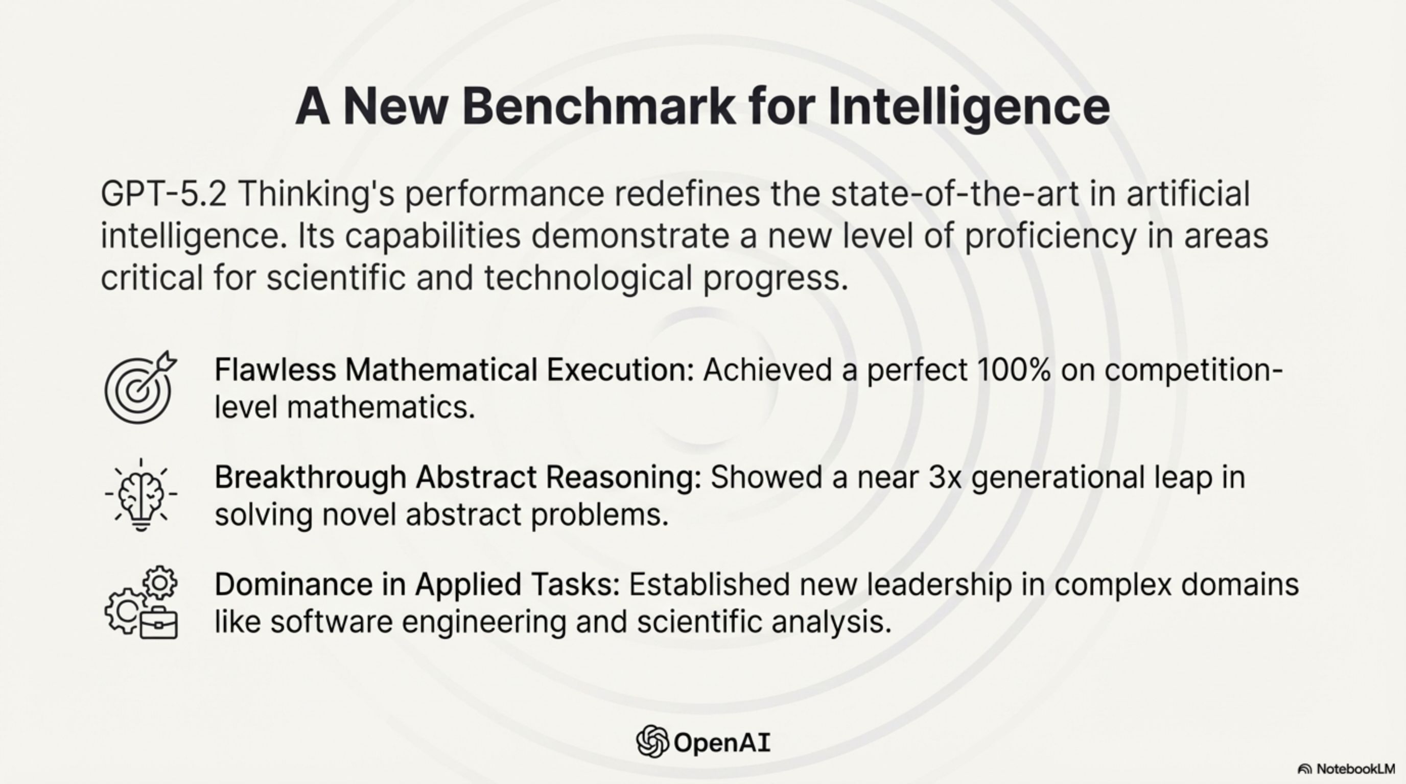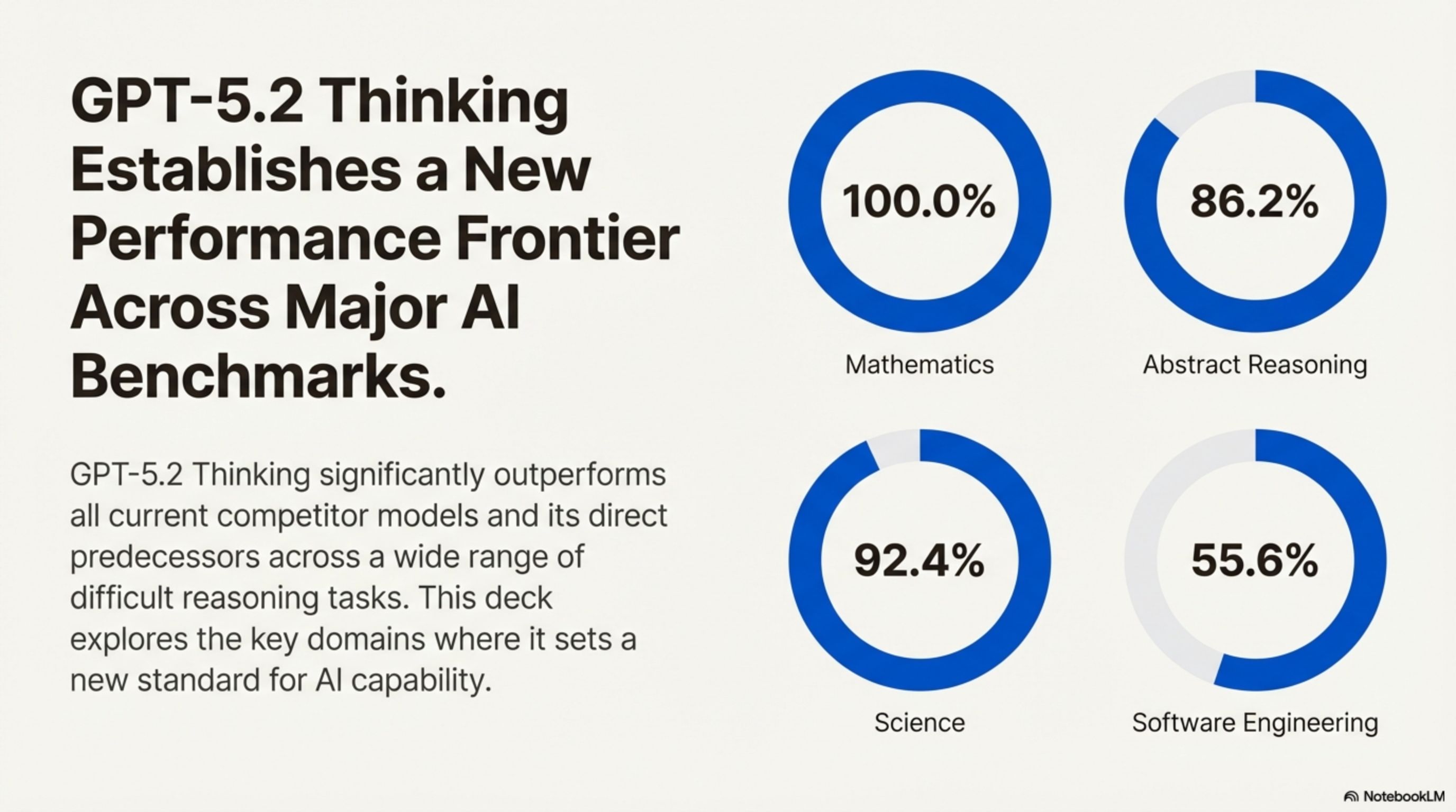 GPT-5.2 Thinking's performance redefines the state-of-the-art in artificial intelligence. Its capabilities demonstrate a new level of proficiency in areas critical for scientific and technological progress.