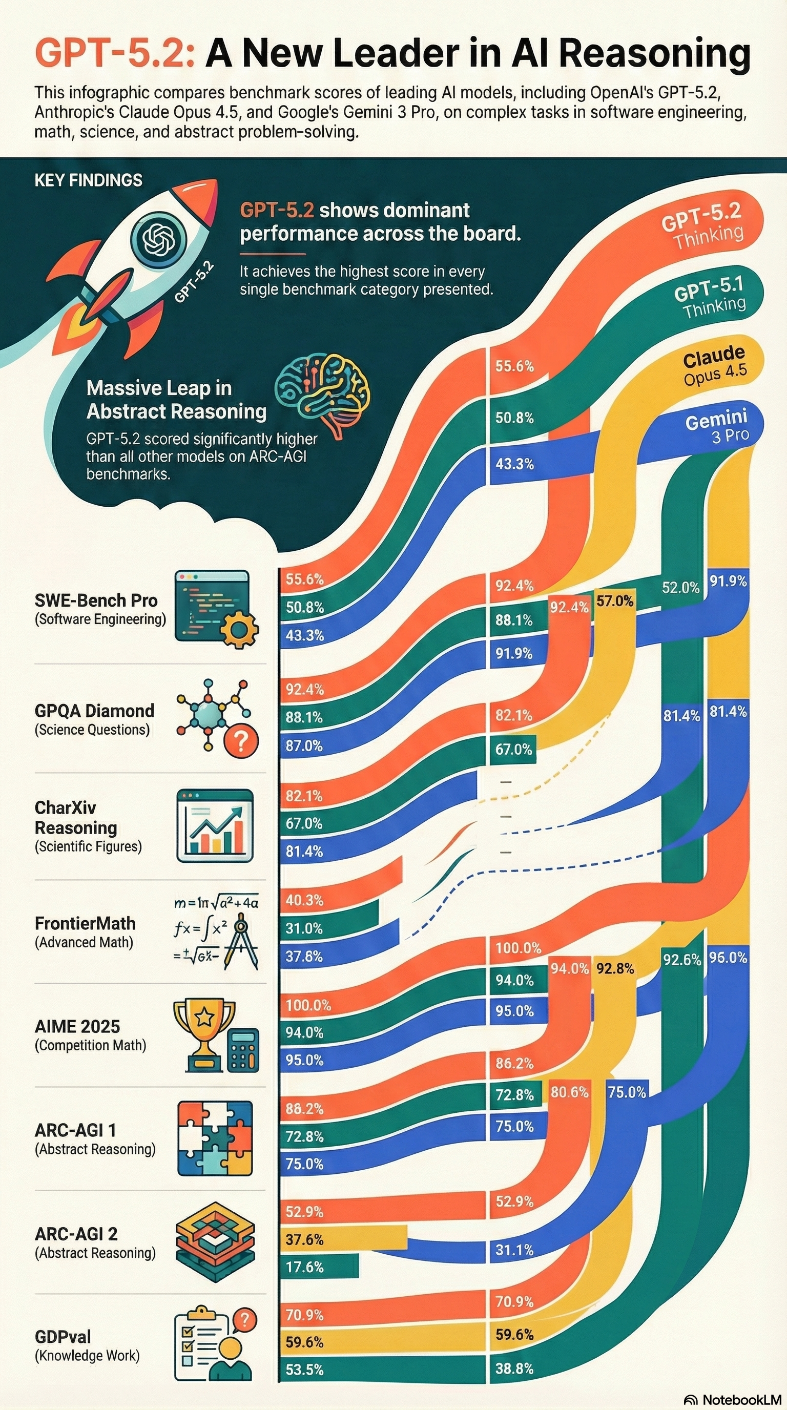 This infographic compares benchmark scores of leading Al models, including OpenAl's GPT-5.2, Anthropic's Claude Opus 4.5, and Google's Gemini 3 Pro, on complex tasks in software engineering, math, science, and abstract problem-solving.